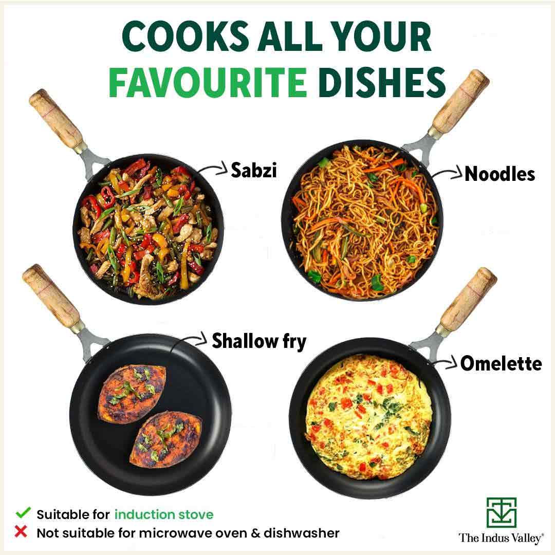 🌿100% NATURAL & TOXIN-FREE: The Indus Valley’s Iron Frying Pan/Skillet (with Wooden and Bakelite Handle) provides the best cooking experience without compromising your health and ease of cooking. This pre-seasoned iron pan can be trusted to be chemical-free and food-safe.