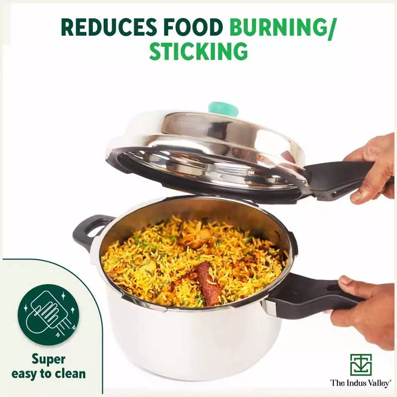 The triple-layer construction of The Indus Valley pressure cooker prevents food from burning or food sticking to its surface, making it super easy to clean.