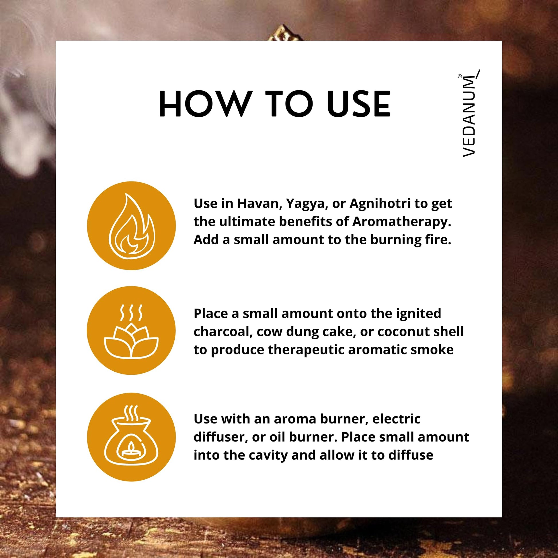 - LONG LASTING AROMA: Vedanum premium resins have no fillers and additives which makes them aromatic for long, with low smoke quality and easy to use, the aroma of resins also easily diffuses into air without much efforts.