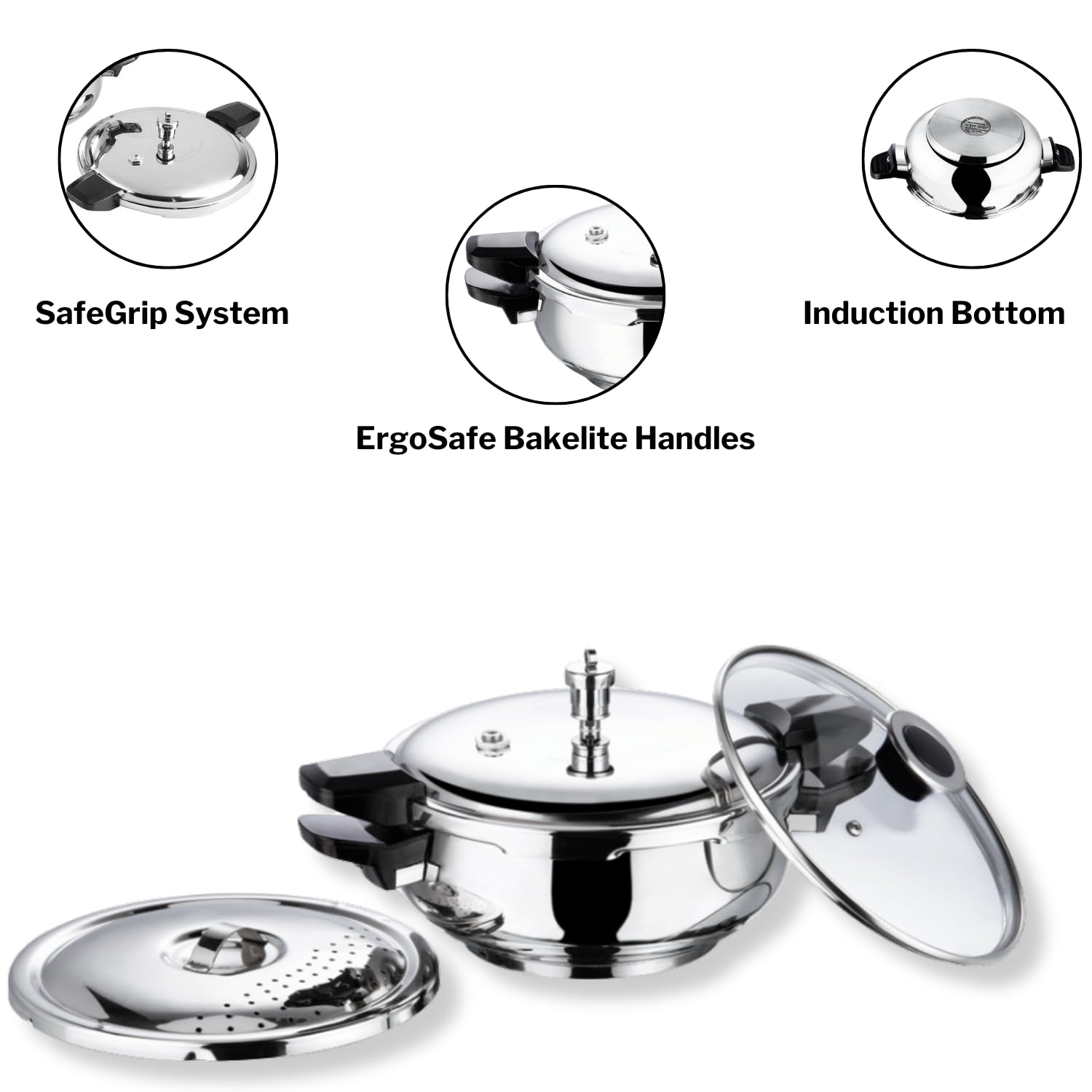 Vinod Magic Stainless Steel Smart 3 in 1 Pressure Cooker 3.5 Litre | 5mm Thick Base | All in One Cooker with Strainer & Glass Lid | Induction and Gas Base | ISI certified | 2 Years Warranty