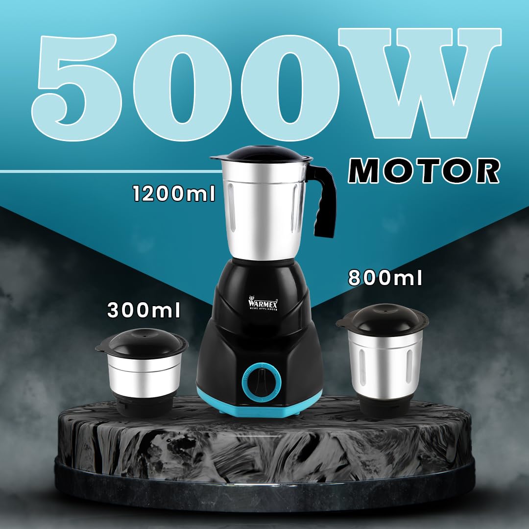Warmex 500W Mixer Grinder with 3 Jars + 2 Years Warranty, Powerful Motor for Efficient Grinding & Blending, Durable & Versatile Kitchen Appliance, Ideal for Home Cooking Needs, Reliable Performance
