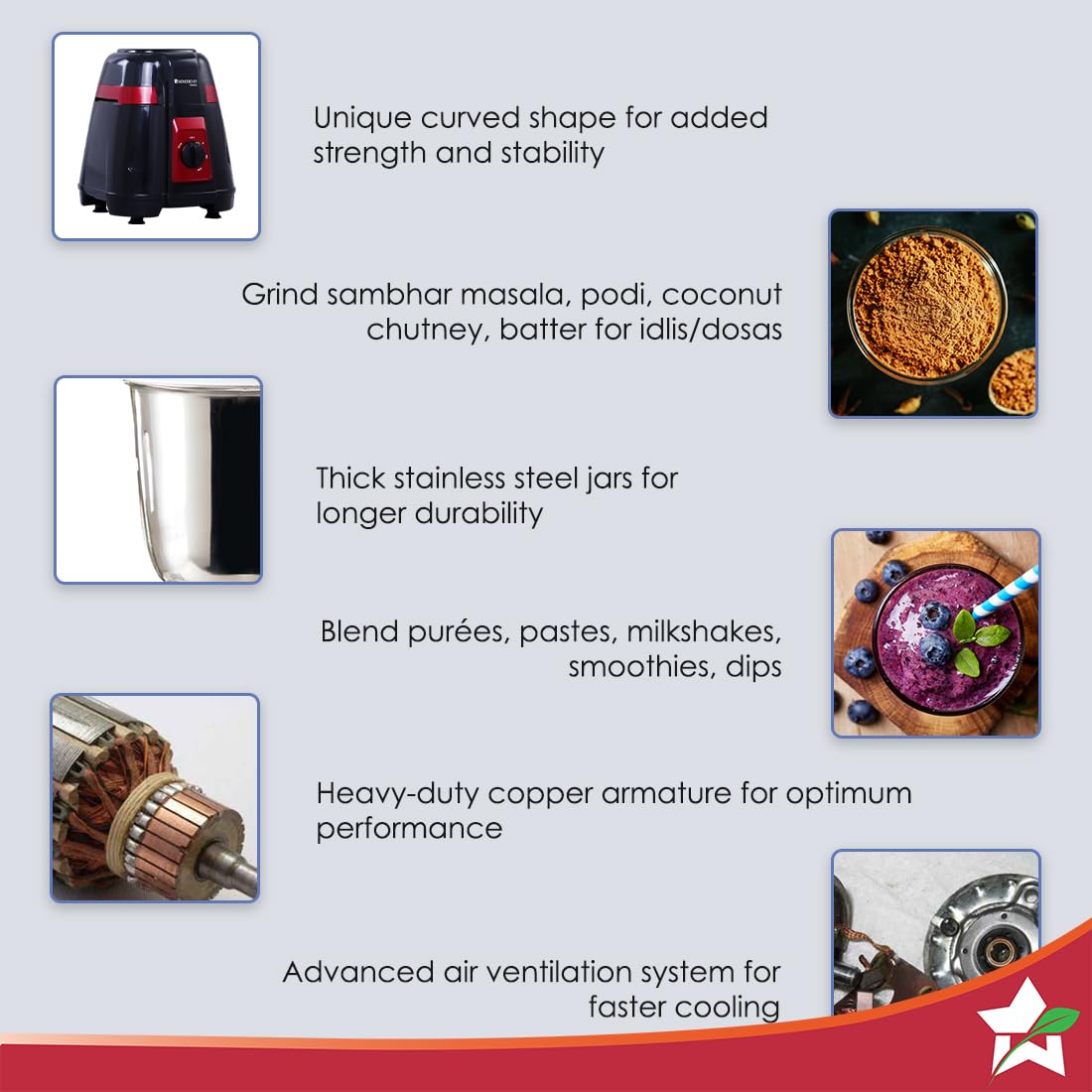 - 750W heavy-duty copper armature motor housed in our unique CURVED design. Anti-rust stainless steel blades grind even the toughest of ingredients to make amazing podi, sambhar masala, coconut chutney, garam masala, idli-dosa batter,purée, pastes, milkshakes, smoothies and much more!