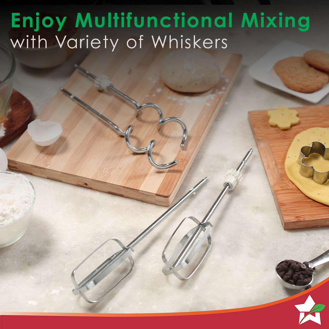- FREE ATTACHMENTS: This mixer includes 3 essential attachments- beaters, dough hooks, and a spatula. The specially designed spatula reduces dough build-up on the sides, ensuring a mess-free mixing experience.
