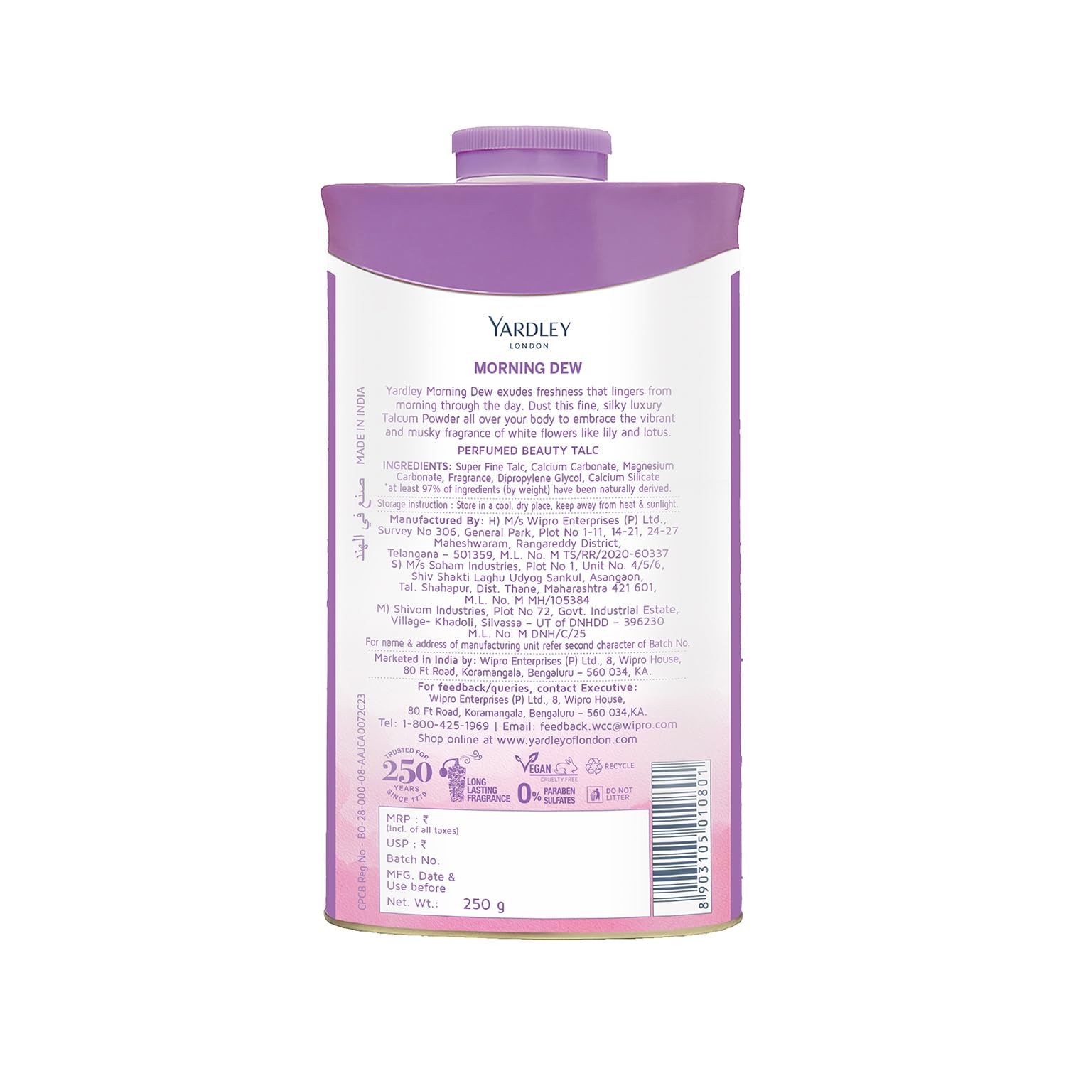 - Embrace the Day With An Aromatic Bliss: Morning Dew talc by Yardley, a fragrant embrace to start your day on a fresh note