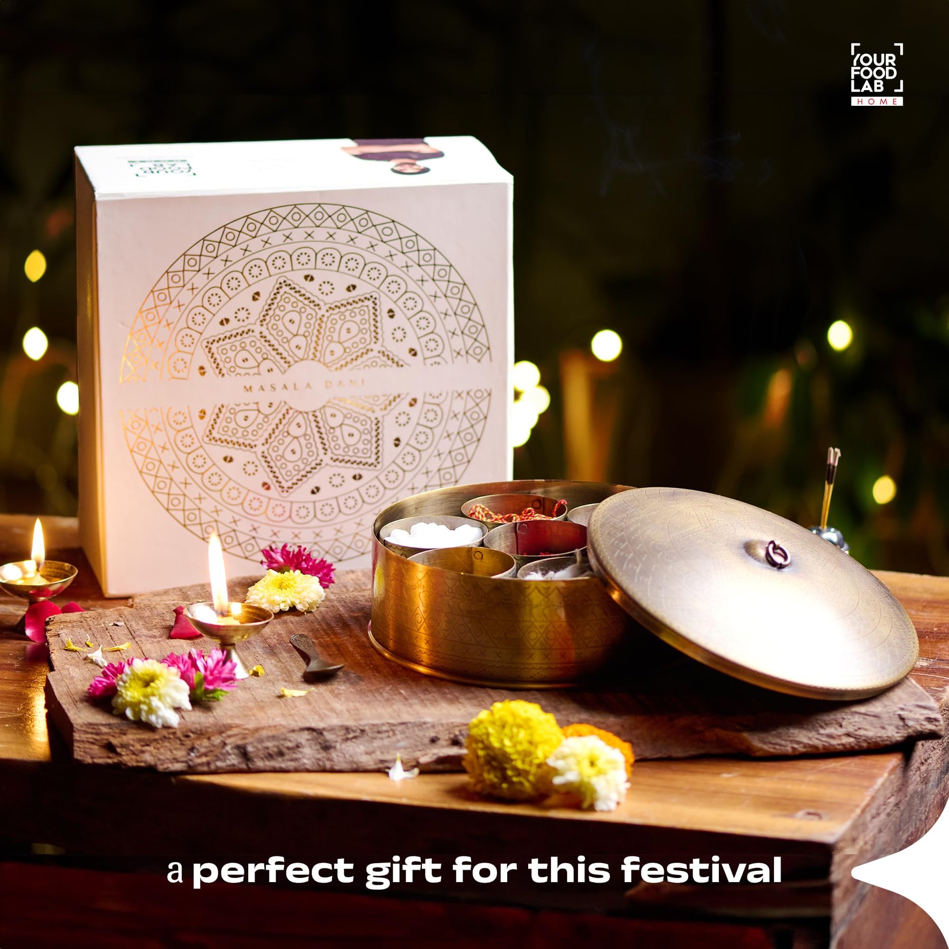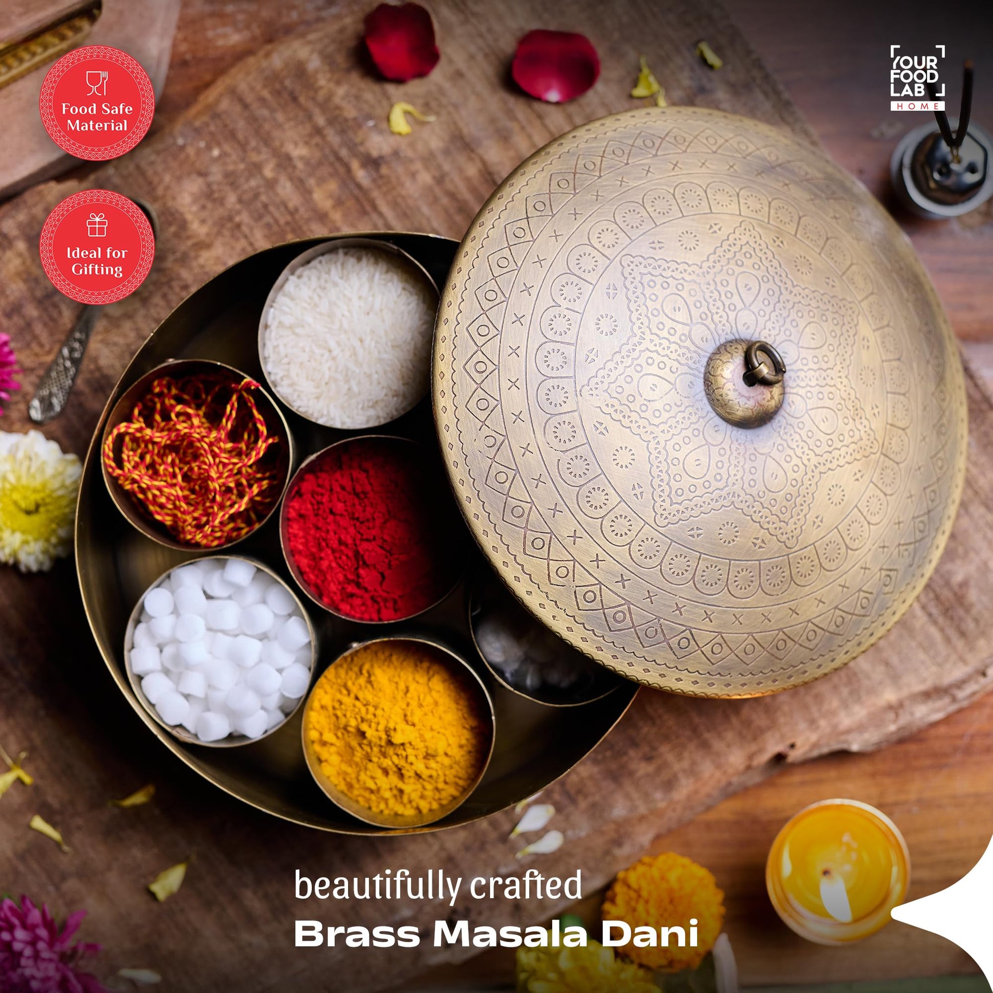 YFL HOME Brass Spice Box for Kitchen with Spoon (Pure Brass, 7 Detachable containers, 100 ML) | Masala box for Kitchen | Spice Storage Container | Stylish Masala Dani for gift