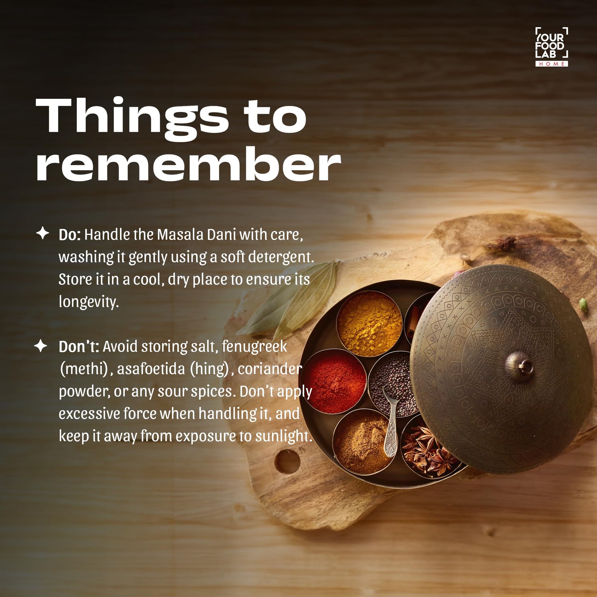 - Caution Against Salt or Sour Spices: Avoid using salt in this Brass Masala Dani to prevent discoloration and potential quality effects on other spices. The brass material can react with salt, which may lead to changes in appearance and spice integrity.