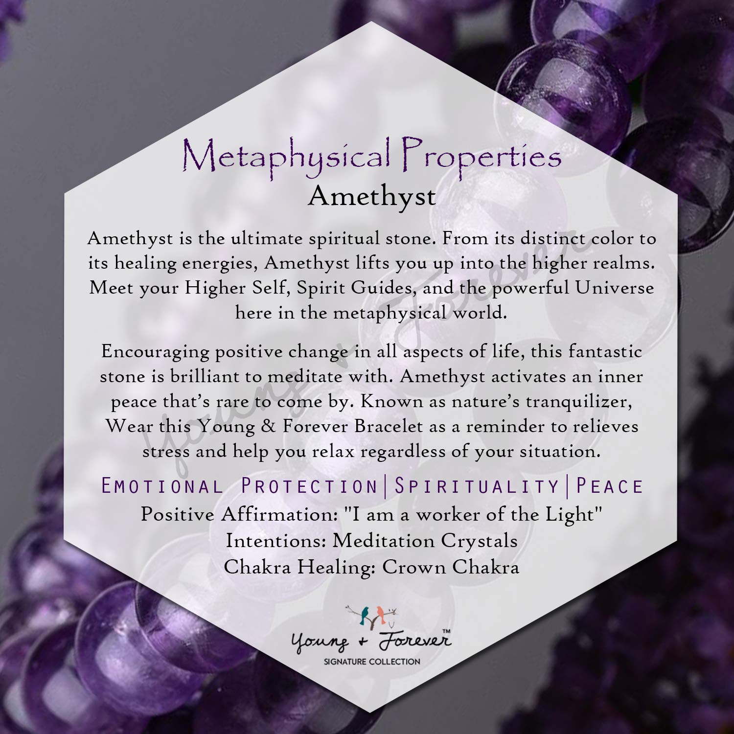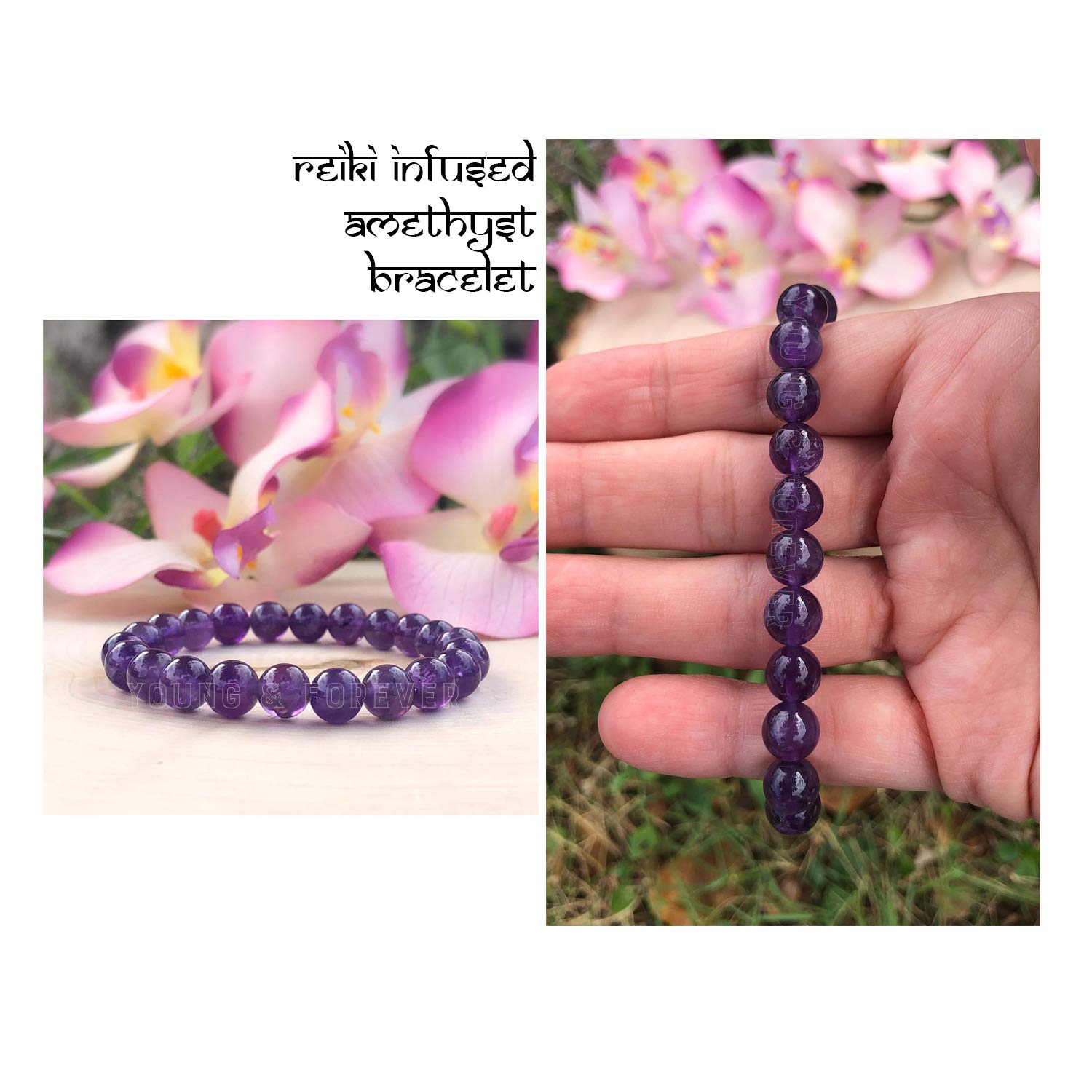 Young & Forever Gift Energized Reiki Crystal Semi Precious Gemstone Amethyst Bracelet for Purification Healing Stone Stretch Bracelet for Men and Women