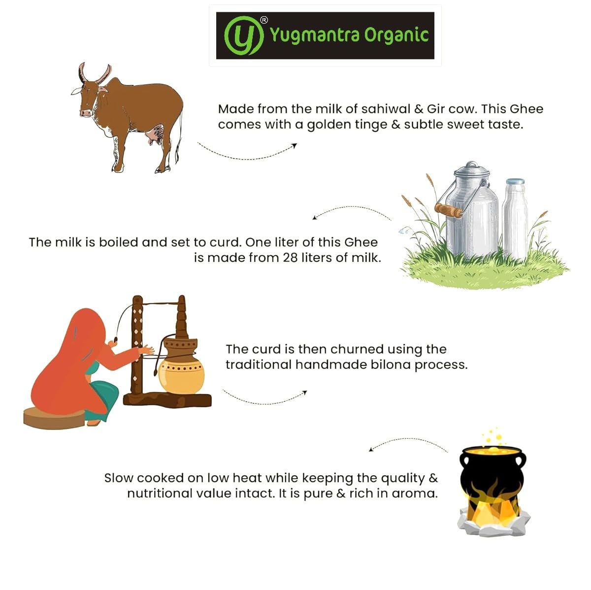 Yugmantra Organic Foods -100 % Natural Pure & Aromatic Desi Sahiwal Cow Ghee -Traditional Churned With Bilona Method|No Added Additives|A2 Danedar Desi Ghee|Immunity Booster - Glass Bottle - 1000 Ml